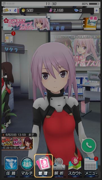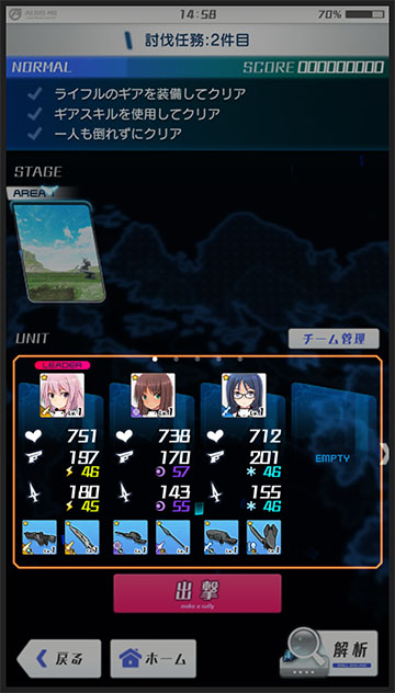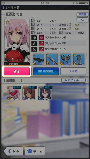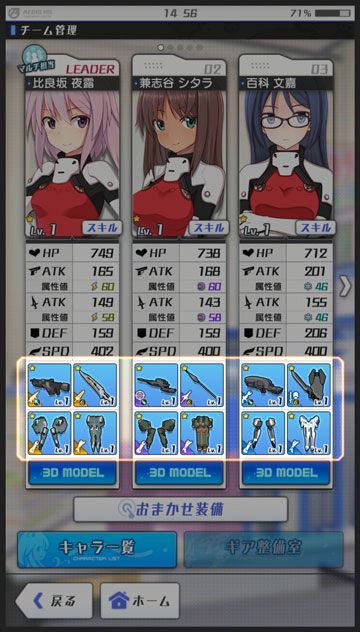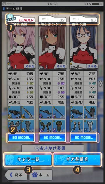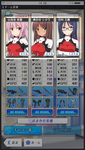 管理をタップするとチーム管理画面へ行きます。ここではチームメンバーの変更や強化、装備変更や装備のレベルアップができます。