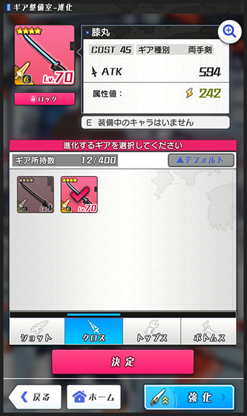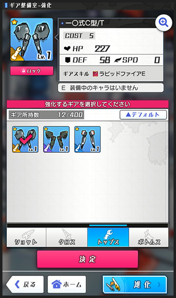 進化画面では、進化に必要な素材の数量の確認やギアの進化ができます。