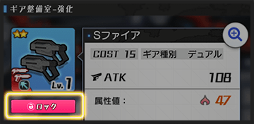 選択したギアが「非ロック」状態の場合、ギア詳細欄に表示されるギアアイコンの下部に「ロック」ボタンが表示されます。