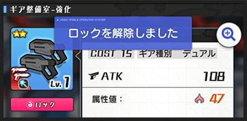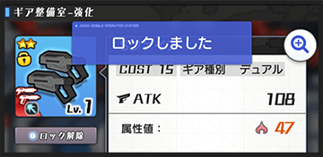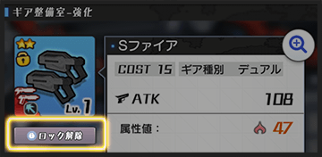 選択したギアが「ロック」状態の場合、ギア詳細欄に表示されるギアアイコンの下部に「ロック解除」ボタンが表示されます。