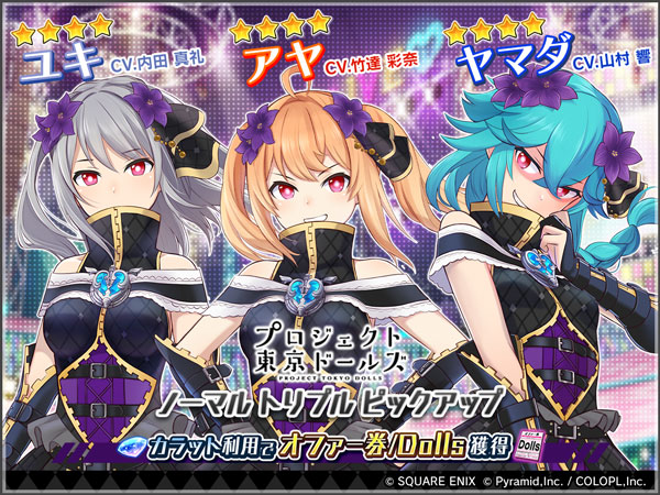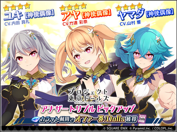 ※「★4/アヤ【神使偶像】」、「★4/ユキ【神使偶像】」、「★4/ヤマダ【神使偶像】」は、本スカウト及び「プロジェクト東京ドールズ セレクトスカウト」以外でスカウトできません。