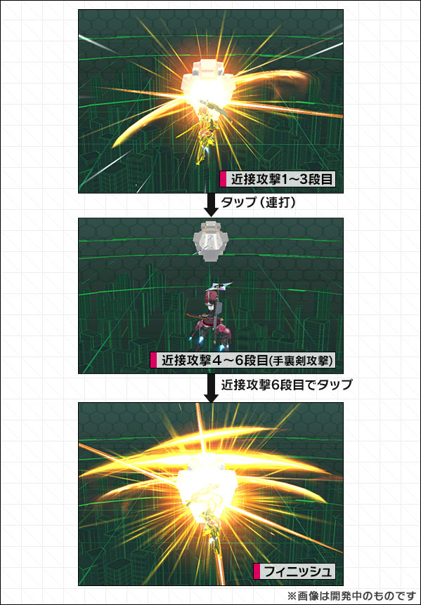 ステップ攻撃後にタップを入力すると、手裏剣攻撃(近接攻撃4~6段目)などの攻撃を行うことができます。